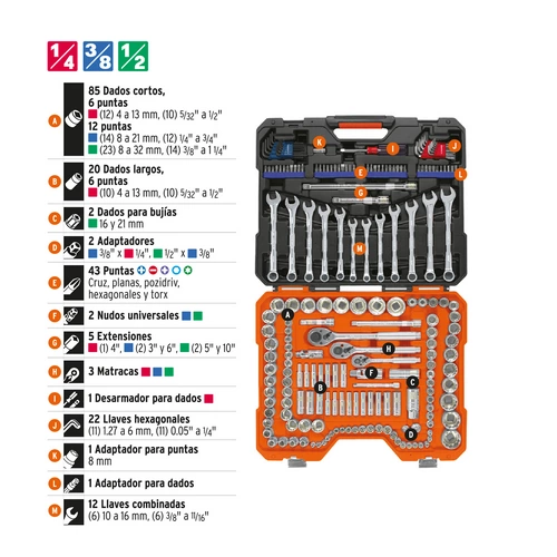 Juego 199 herramientas 1/4′, 3/8′ y 1/2′ std y mm p/mec nico
