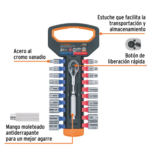 Juego de dados mm y std con matraca, cuadro 1/4′, Truper